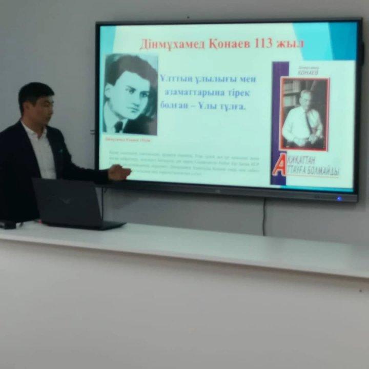 12 қаңтар мемлекет және қоғам қайраткері-Дінмұхамед Ахметұлы Қонаевтың туған күні аясында 15 қаңтар күні "Дінмұхамед Ахметұлы Қонаев-ұлтын сүйген ұлы тұл" тақырыбында тарих пәні мұғалімдері Тынаев Серік, Аманбеков Бекайдар, Жантелиева Мөлдір ашық сабақ өтті.